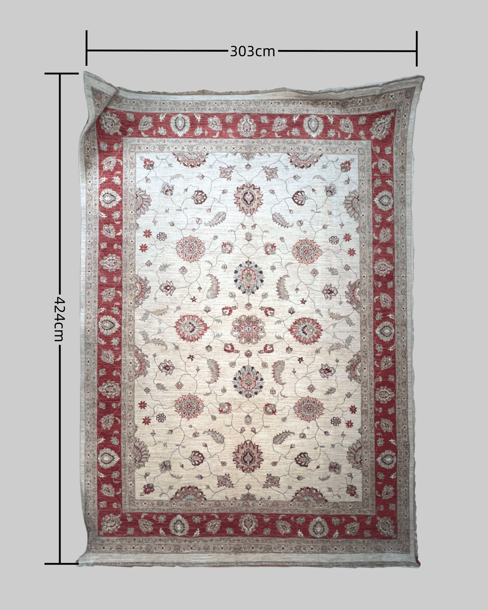 This exquisite XL Ziegler rug is a true work of art, hand-knotted by skilled artisans using high-quality wool for unmatched durability and softness. Its intricate floral and vine motifs, framed by a bold red border, bring a sense of refined elegance to any interior. The harmonious blend of ivory, beige, and deep red enhances traditional and modern settings alike, making it a versatile statement piece for spacious living rooms, dining areas, or offices.
